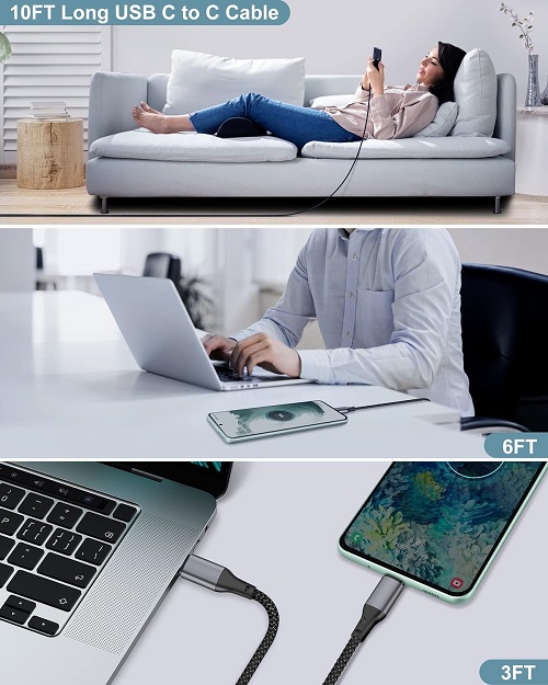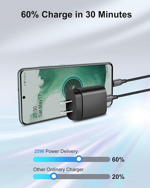 [25W Samsung Fast Charger] 25W USB C charger block with PD 3.0 fast charging USB C port provides Max 25W output power. Adaptive fast charger for Samsung Galaxy S23/S22 from 0% to 60% in 30 minutes, save you about 1 hour and helps you work efficiently. [Widely Compatibility] 25W PD PPS USB-C Power Adapter fast charging for Samsung Galaxy S23 Ultra 5G, S23, S23+, S22 Ultra 5G, S22, S22+, S21 FE, S21, S20, Note 20 Ultra 5G, Note 20, Note 10 5G, S10, S9, S8, Z Flip4 5G, Z Fold4 5G, A73, A53, A23, A71, A70, A80. Google Pixel 7 Pro, 7, 6 Pro, 6, 5, 4, 3XL, LG G8, G7 ThinQ, G6, G5, Android Phones, and other USB-C enabled devices. [Braided USB C to USB C Cable] Included 3FT 6FT 10FT multi length USB C charger cable easy for fast charging on different occasions, such as for travel, home, car, office, etc. Braided with durable nylon material, it has been tested to withstand at least 20000+ times bending. [Superior Safety Fast Charging] Built in intelligent chips which can protect your devices against damage caused by short-circuit, over-current, over-heating, and over-charging issues. When the battery capacity is full, it will automatically stop charging to ensure the safety of your device. [Package & Service] 2 X 25W PD USB C Super Fast Charging Wall Charger, 3FT 6FT 10FT Nylon Braided Type C to C Charging Cable, offer 7 X 24 hours of friendly customer service.