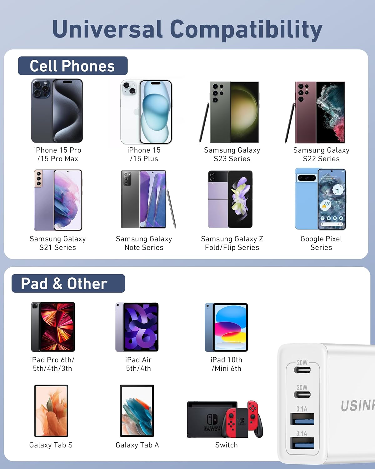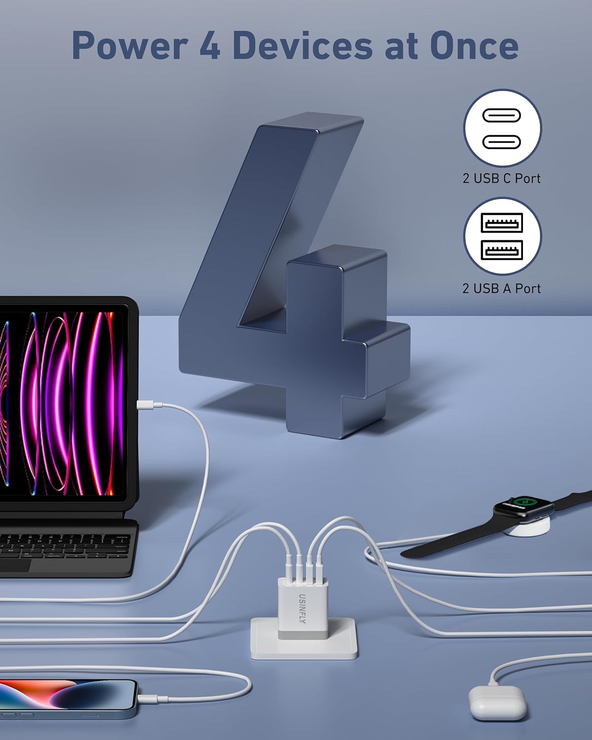 The USB C charger block supports a maximum power output of 40W. 4-Port design with two USB-C and two USB-A, enough to charge the iPhone 15 from 0 to 60% in just 30 minutes, provide 3X faster than 5W charger.