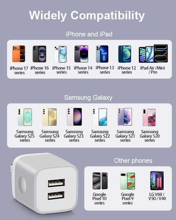 [Powerful Charging]: USB Charger Block with dual USB Output: 5V/2.1A and Input:100-240V, which enables you to charge two smart phone or tablet devices simultaneously at full speed [Safety & Reliable] : The wall charger has multiple safety protection system to prevent over charging, over current, over heat and short circuit. When the battery is fully charged, USB charger box will automatically stop charging to protect your connected device. [Compact & Lightweight]: Charging block with compact design, lightweight, easy to carry, does not occupy socket space, ideal for travel, home and office [Widely Compatibility]: USB Wall Charger compatible with iPhone 17 16 15 14 13 12 11 Pro Max Mini XS Max XR X 8 7 6 6S Plus SE 5S 5C, Pad Pro Air Mini, Samsung, LG, Moto, Google Pixel, Android Phones, Tablets, GPS Devices, E-book Readers, Bluetooth Speaker, MP4 Players and more [What Your Get]: 3-Pack Dual Port USB Charger Power Adapter, 24h/7d Friendly customer service