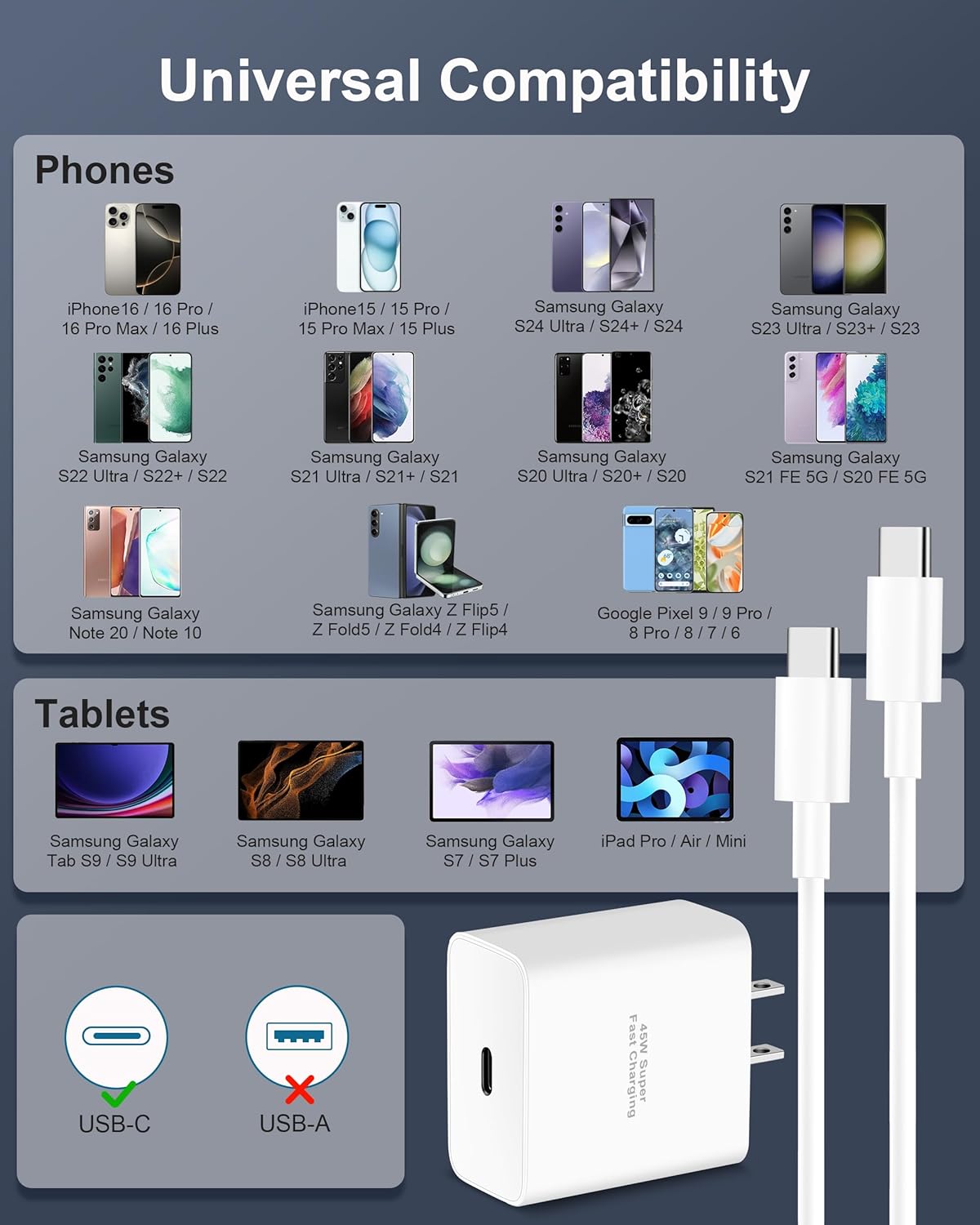You could get 5% back at Amazon.ca, Whole Foods Market stores, and grocery stores for 6 months upon approval for the Amazon.ca Rewards Mastercard. Learn more. 45W Super Fast Charger 3.0: USB C charger block equipped with PD/PPS 3.0 USB C fast charging technology to provide maximum output power of 45W, fast charge for your iPhone 16 up to 70% in about 30 minutes, Charging faster and taking less time 6FT USB-C Cable Fast Charging: The 45W super fast USB C charger is equipped with extra longer 6FT USB C to C cable, Provide a maximum output power of 60W (3A/20V) and allow you a longer charging distance. 6 Feet length is convenient for usage while charging and syncing at home, office, couch or travel in bed, hotel rooms, and more Universal Compatibility: This 45W USB C wall charger is compatible with most of from phones, tablets to laptops. Support PD super fast charging for iPhone 16/16 Pro/16 Pro Max/16 Plus, iPad Pro 13/12.9/11 inch, iPad Air 6th/5th/4th, iPad 10th, iPad Mini 6, Google Pixel 9/9 Pro/9 Pro XL/9 Pro Fold, Samsung Galaxy S24/S23/S22/Ultra/Note 20/10, also support high-speed charging for iPhone 15/15 Pro/15 Pro Max/Plus, Pixel 8/7/6/5/4 XL, LG, Moto, Android Phones Safe and Reliable: Built-in intelligent chip and multi-protect system, the type c charging block can auto-detect the power your device needs and adjust accordingly, protect your devices against over-voltage, over-current, over-heating, and short-circuit What You Get: 2 x 45W Fast USB C Wall Charger Block, 2 x 6FT USB-C to USB-C Charging Cable