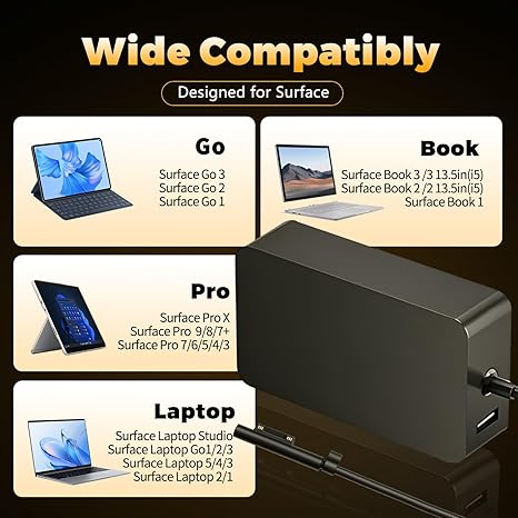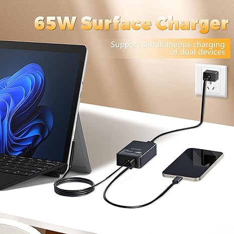 【65W Fast Charging】Output:15V-4A 65W,Input: 100-240V 50-60 Hz.Watt: 65.0 Watt,USB Port: 5V-1A 5W,USB port can charge your phone.you will get 1 x 65W power adapter, 1 x power supply cord 【Universal Compatibility】: This Microsoft Surface Pro Charger is compatible with a wide range of models, including Surface Pro 10,9, 8, 7+, 7, 6, 5, 4, 3, X, Windows Surface Laptop 5, 4, 3, 2, 1, Studio, Surface Book 3, 2, 1, and Surface Go Laptop,Tablet 3, 2,1.for Surface models 1706, 1866, 1796, 1724, 1625, 1867, 1735, 1800 Surface Laptop Studio charger 【Fast Charger】:65W surface laptop charger is designed to provide fast and efficient charging for your Microsoft Surface Charger, Surface Pro 9 Charger(65W) ,Surface Pro 8 Charger(65W), Surface Pro 7 Charger(65W),Surface Pro 7+ Charger(65W), Surface Pro 6 Charger(65W), Surface Pro 5 Charger(44W/36W),Surface Pro 4 Charger(44W/36W), Surface Pro 3 Charger(44W/36W),Surface Pro X Charger(65W).Surface Pro 10 Charger(65W) 【Multiple Protection】: This Fast Charger intelligently identify your devices automatically and provide the fastest and most efficient output current,The built-in Smart charging chip and 2.0 intelligent charging system in the USB C Wall charger efficiently protect your devices by preventing over-current, over-voltage, overheating, and short-circuit. 【Compact & Travel-Friendly】This adapter is very portable with light weight, fitting perfectly in a small pocket inside your laptop bag and easy to carry with,Charge multiple devices with 1 charger at the office, at home or travel,pursuing quality life,If you have any questions about the charger, please fell free to contact us.