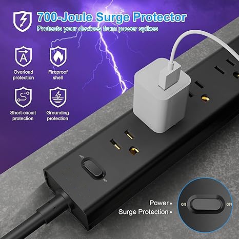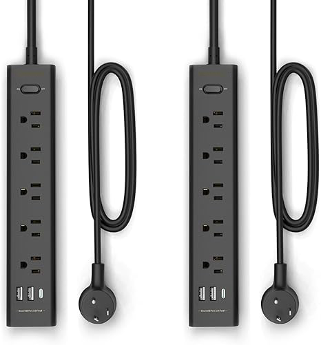 【8-in-1 black surge protector power strip】 - With 5 AC outlets and 3 USB ports(1 USB C Port), this USB power strip can charge up to 8 devices simultaneously with no more than 1250W/10A. The built-in smart IC chip automatically adjusts and provides optimal charging speed for your electronic devices with USB power output up to 2.4A/port, USB-C port Output 5V/3A MAX, 15W total。 【Multiple Protection power strip with usb ports】 - This surge protector features surge protection rated up to 700 joules to protect your electronics from spikes and fluctuations. The power switch also features overload protection, which automatically detects external loads and shuts off and disconnects all power at the first opportunity, protecting your equipment well. To prevent problems with the circuit again, please do not exceed its 1250W power rating before resetting. 【Safety multi-plug powerstrip】 - made of fireproof ABS+PC (Grade: UL-V0, the highest fire rating), can withstand high temperatures up to 1382℉, high-end solid state capacitors to ensure complete protection of your device from electrical short circuits, overheating, overcharging, overcurrent and overvoltage, so it will not heat up during use and keep your device safe 【Mountable Right Angle Flat Plug power strips & surge protectors】 - 18AWG extension cord surge protector with flush plug for easy access to tight spaces, even in complex use environments, plus 2 mounting hole locations on the back of the power strip for easy installation on horizontal or vertical walls or under-desk mounting for ease of use. 【What you get】 - 2 surge protector power strip and 2 sets of mounting screws;If you have any problem with our product, please to contact us and we will reply you within 24 hrs.