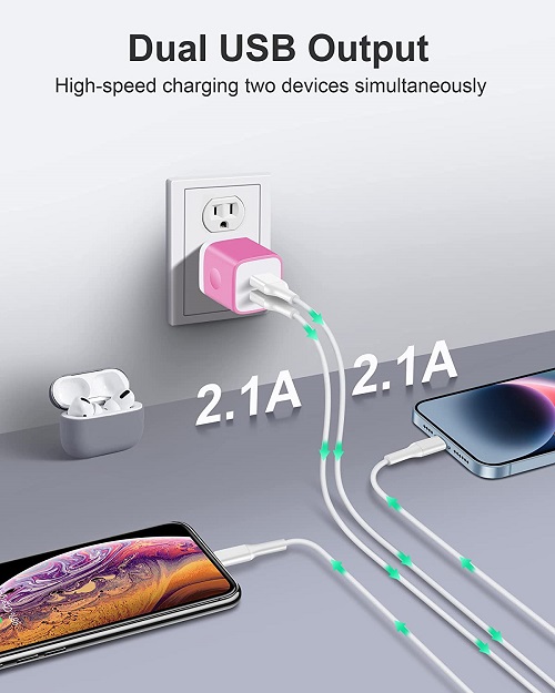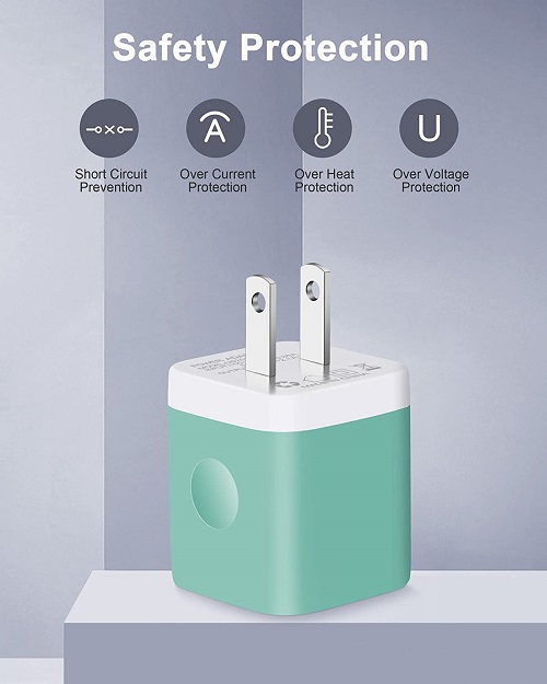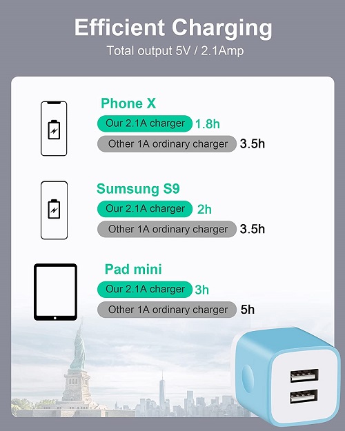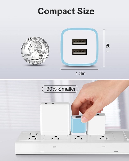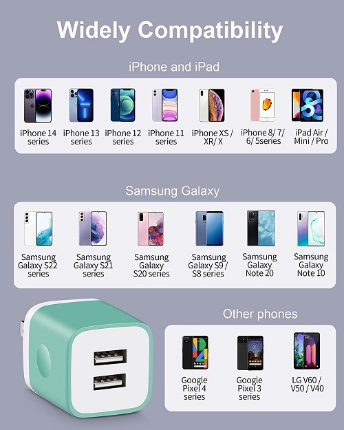 Powerful Charging: Charger Block with dual USB Output: 5V/2.1A and Input:100-240V, which enables you to charge two smart phone or tablet devices simultaneously at full speed. Safety & Reliable: The wall charger has multiple safety protection system to prevent over charging, over current, over heat and short circuit. When the battery is fully charged, USB charger box will automatically stop charging to protect your connected device. Compact & Lightweight: Charging block with compact design, lightweight, easy to carry, does not occupy socket space, ideal for travel, home and office. Widely Compatibility: USB Wall Charger compatible with iPhone 14 13 12 11 Pro Max Mini XS Max XR X 8 7 6 6S Plus SE 5S 5C, iPad Pro Air Mini, Samsung, LG, Moto, Google Pixel, Android Phones, Tablets, GPS Devices, E-book Readers, Bluetooth Speaker, MP4 Players and more. What Your Get: 3-Pack Dual Port USB Charger Adapter (Blue, Green, Rose Red), 24h/7d Friendly customer service. If you have any questions, please feel free to contact us and we will reply to you within 24 hours.