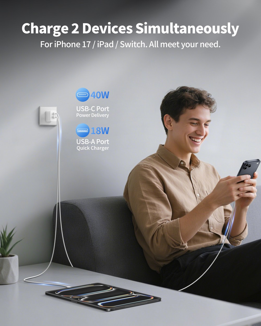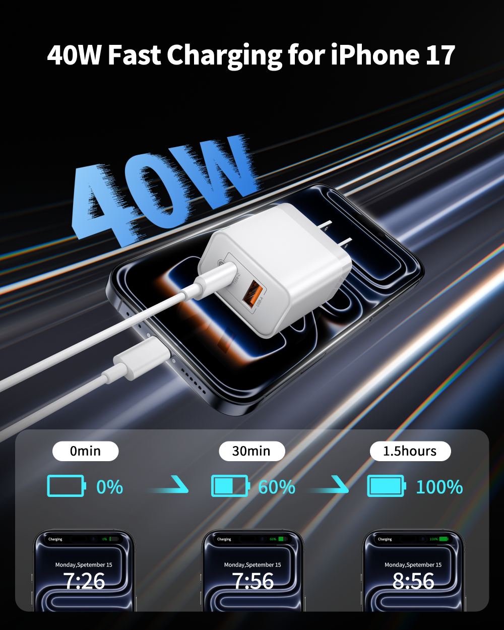 40W Fast Charging for iPhone 17 Series: The USB C charger block adopts the 2025 all-newly upgraded PD 3.0 fast charging technology, with a maximum output power of 40W. It can charge your iPhone 17 up to 70% power in just 30 minutes and full charge in only takes 1.5 hours, 5X faster charging speed, cutting typical charging time in half Dual Port Compact Design: GaN technology makes the type c wall charger compact and portable, with a 100% increase in operating frequency, 30% smaller than the ordinary charger, easy to carry. Equipped with USB-C and USB-A dual ports, this fast charging block allowing you charge 2 devices simultaneously to minimize waiting time, travel essential for cell phone, tablet, laptop, etc 10FT iPhone 17 Charging Cord: The iPhone 17 charger cable is made of premium TPE material and thickened copper core, which is sturdy and durable, with stable output power and continuous charging. Supports Max 60W (20V/3A) high output and 480Mbps data transfer speed. 10FT long cable allows you to charge in sofa, bedroom, office, even in the back seat of the car Universal Compatibility: 40W USB-C fast charger compatible with iPhone 17/17 Pro/17 Pro Max/Air/16/16 Plus/16 Pro/16 Pro Max/16e/15/15 Plus/15 Pro/15 Pro Max, iPad Pro 13/12.9/11 inch, iPad Air 13 inch M3/M2 2025/2024, iPad Air 5th/4th, iPad A16, iPad 10th Gen, iPad Mini A17 Pro 2024, iPad Mini 6th, Galaxy, Pixel, LG, Moto, Tablet, Android, and more USB-C devices What You Get: 1 x 40W Dual Port USB-C Wall Charger Block, 1 x 10FT USB-C to USB-C Cable. The soft indicator light design enables you to quickly determine whether the power is on or off. Suitable use for home, office, or travel, it is a perfect for iPad accessory. If you encounter any problems while using the 40Watt charger, feel free to contact our customer service team