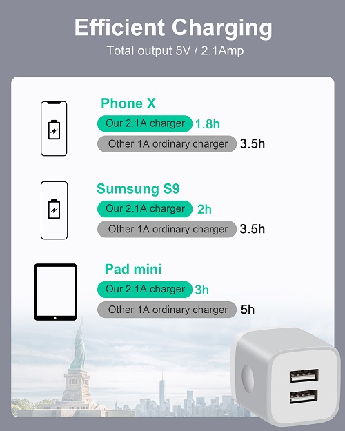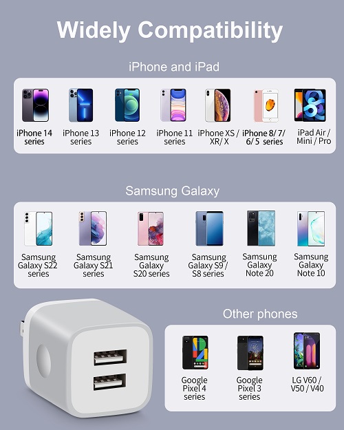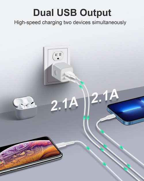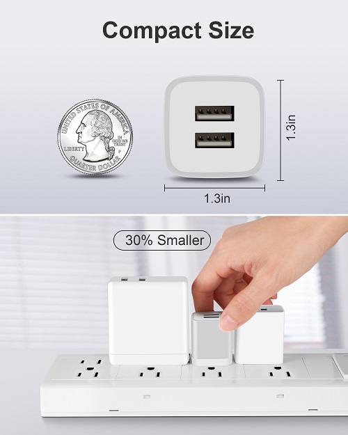Powerful Charging: Charger Block with dual USB Output: 5V/2.1A and Input:100-240V, which enables you to charge two smart phone or tablet devices simultaneously at full speed. Safety & Reliable: The wall charger has multiple safety protection system to prevent over charging, over current, over heat and short circuit. When the battery is fully charged, USB charger box will automatically stop charging to protect your connected device. Compact & Lightweight: Charging block with compact design, lightweight, easy to carry, does not occupy socket space, ideal for travel, home and office. Widely Compatibility: USB Wall Charger compatible with iPhone 14 13 12 11 Pro Max Mini XS Max XR X 8 7 6 6S Plus SE 5S 5C, iPad Pro Air Mini, Samsung, LG, Moto, Google Pixel, Android Phones, Tablets, GPS Devices, E-book Readers, Bluetooth Speaker, MP4 Players and more. What Your Get: 3-Pack Dual Port USB Charger Adapter (Gray), 24h/7d Friendly customer service. If you have any questions, please feel free to contact us and we will reply to you within 24 hours.
