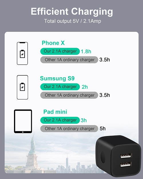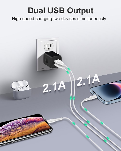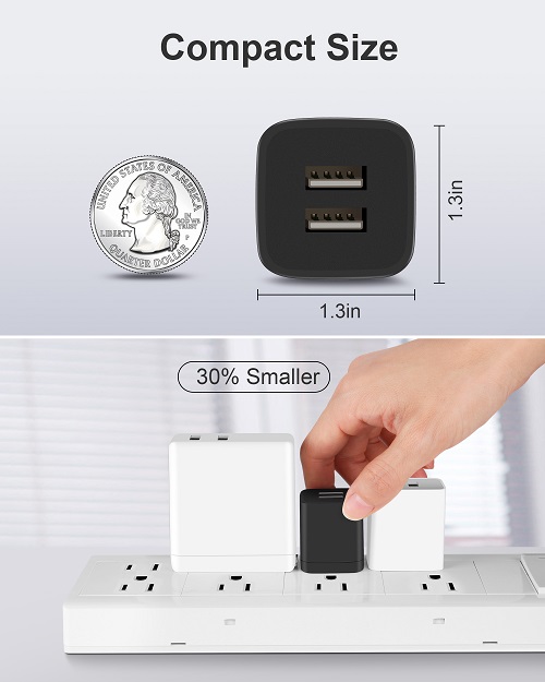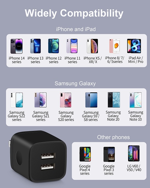 Powerful Charging: Charger Block with dual USB Output: 5V/2.1A and Input:100-240V, which enables you to charge two smart phone or tablet devices simultaneously at full speed. Safety & Reliable: The wall charger has multiple safety protection system to prevent over charging, over current, over heat and short circuit. When the battery is fully charged, USB charger box will automatically stop charging to protect your connected device. Compact & Lightweight: Charging block with compact design, lightweight, easy to carry, does not occupy socket space, ideal for travel, home and office. Widely Compatibility: USB Wall Charger compatible with iPhone 14 13 12 11 Pro Max Mini XS Max XR X 8 7 6 6S Plus SE 5S 5C, iPad Pro Air Mini, Samsung, LG, Moto, Google Pixel, Android Phones, Tablets, GPS Devices, E-book Readers, Bluetooth Speaker, MP4 Players and more. What Your Get: 3-Pack Dual Port USB Charger Adapter (Black), 24h/7d Friendly customer service. If you have any questions, please feel free to contact us and we will reply to you within 24 hours.