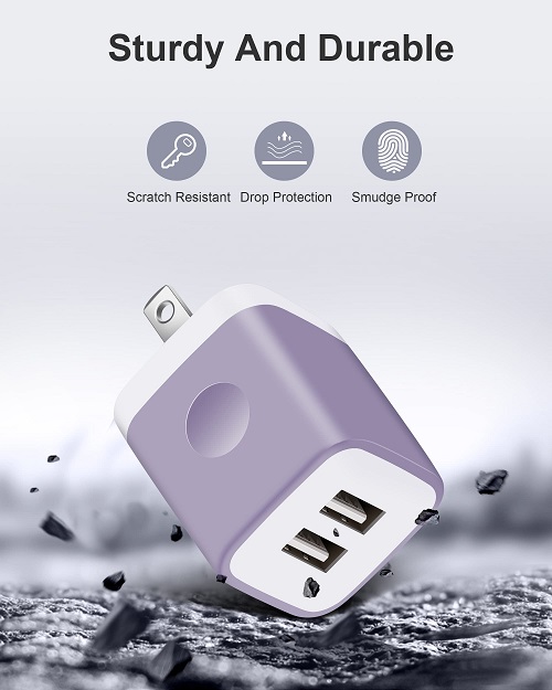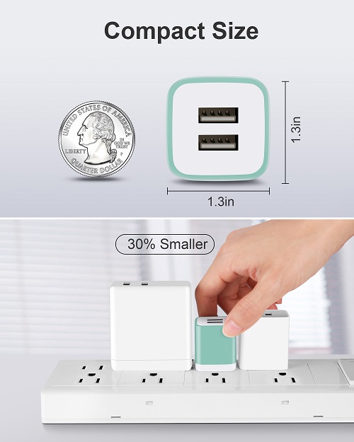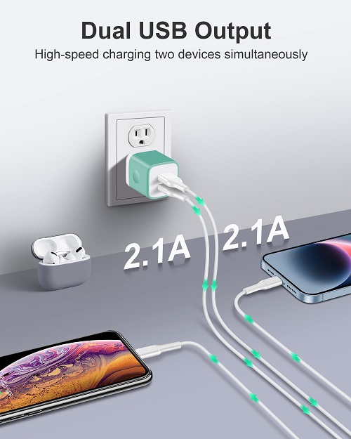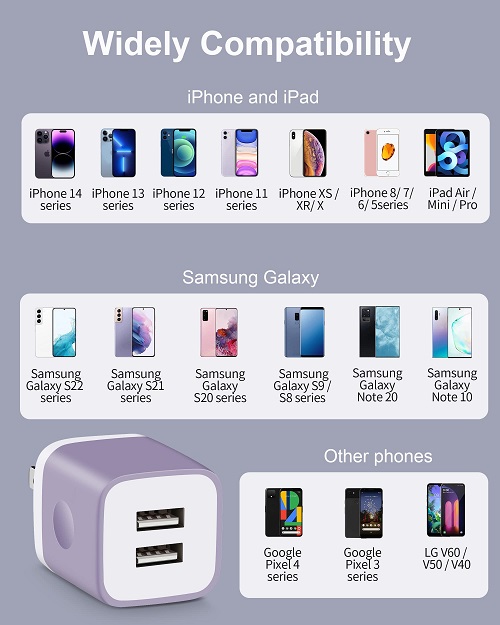 Powerful Charging: Charger Block with dual USB Output: 5V/2.1A and Input:100-240V, which enables you to charge two smart phone or tablet devices simultaneously at full speed. Safety & Reliable: The wall charger has multiple safety protection system to prevent over charging, over current, over heat and short circuit. When the battery is fully charged, USB charger box will automatically stop charging to protect your connected device. Compact & Lightweight: Charging block with compact design, lightweight, easy to carry, does not occupy socket space, ideal for travel, home and office. Widely Compatibility: USB Wall Charger compatible with iPhone 14 13 12 11 Pro Max Mini XS Max XR X 8 7 6 6S Plus SE 5S 5C, iPad Pro Air Mini, Samsung, LG, Moto, Google Pixel, Android Phones, Tablets, GPS Devices, E-book Readers, Bluetooth Speaker, MP4 Players and more. What Your Get: 3-Pack Dual Port USB Charger Adapter (Blue, Green, Purple), 24h/7d Friendly customer service. If you have any questions, please feel free to contact us and we will reply to you within 24 hours.